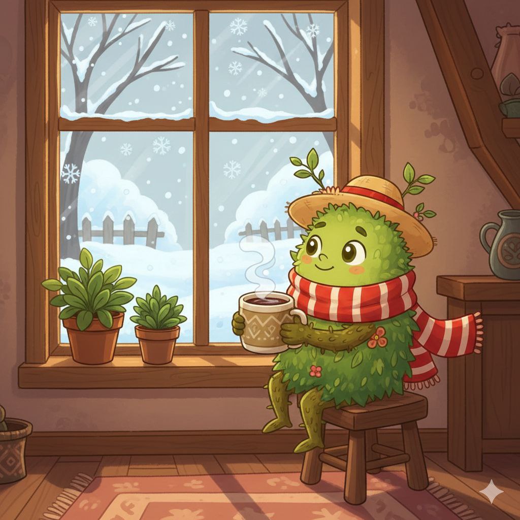Зимой Зеленик отдыхает, наблюдает за снегом и готовится к новому сезону, мечтая о будущем урожае.