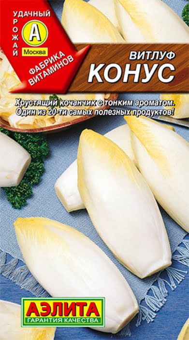 Витлуф Конус — это отечественный сорт салатного цикория. Предназначен для получения свежей продукции во внесезонное зимнее время. Летом из семян выращивают корнеплоды, зимой из корнеплодов выгоняют в темноте хрустящие кочанчики с тонким ароматом, массой 18-30 г. Диетологи признают витлуф одним из двадцати самых полезных продуктов. Он благоприятно влияет на работу печени, сердечно-сосудистой системы, органов пищеварения; отличается низкой калорийностью – 15 ккал на 100 г. Во вкусе присутствует легкая пикантная горчинка. Урожайность 24-25 кг/м 2 при высадке 250 корнеплодов на 1 м2.