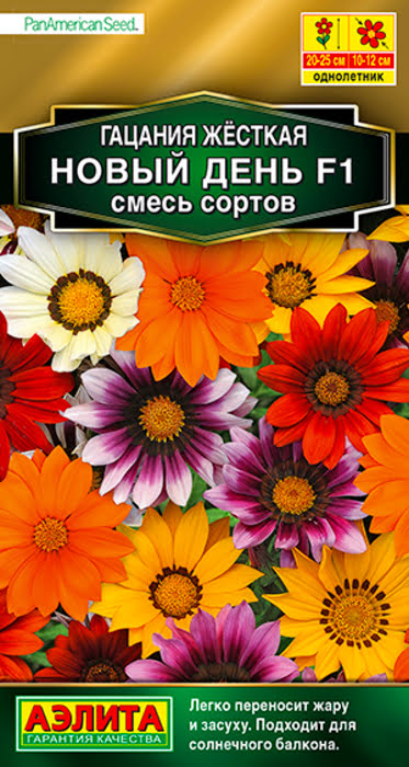 Гацания Новый день F1, смесь окрасок — это это растение, имеющее компактную, густую розетку серебристых листьев высотой 20-30 см. Цветение продолжительное – с июля до поздней осени. Крупные (10-12 см) эффектные соцветия, в центре которых жёлтую серединку окантовывает шоколадный браслет, напоминают «павлиний глаз». Цветы пригодны для срезки.