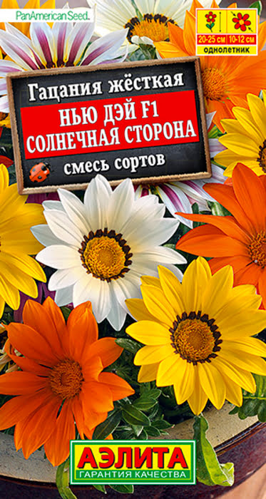 Гацания Нью Дэй F1 солнечная сторона, смесь окрасок — это удачно подобранная фирменная смесь, как нельзя лучше отражающая второе название гацании – «полуденное солнце». Гибридная серия Нью Дей F1 создавалась с целью получения коренастых компактных растений с более короткими цветоносами и более крупными соцветиями, чем у конкурирующих серий. Это успешный результат американской селекции.