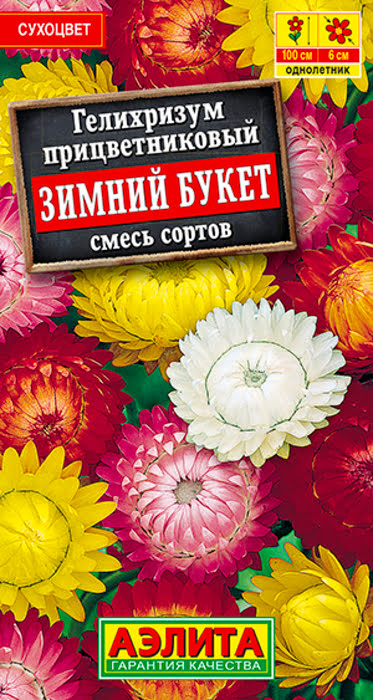 Гелихризум Зимний букет, смесь окрасок — это сорт высокорослых (100 см) гелихризумов. Яркие махровые соцветия-корзинки Ø5-6 см с жесткими, пленчатыми лепестками традиционно используются в сухих букетах. Растения неприхотливые – холодостойкие, засухоустойчивые, практически не требуют ухода. Обильно цветут с июля по октябрь. Отлично смотрятся в среднем ярусе миксбордера и моногруппами. Для зимних букетов соцветия срезают в полуроспуске, с закрытой серединкой и сушат вниз головками в тени.