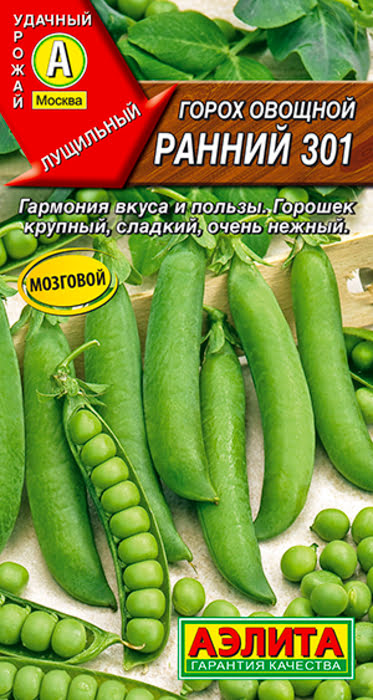 Горох овощной Ранний 301 — это скороспелый сорт с дружным созреванием бобов. Период от всходов до технической спелости 50-65 дней. Стебель длиной 68-71 см. Бобы лущильные, прямые, длиной 6-8 см. Общее число бобов на растении – 13-17 шт, семян в бобе – 5-7 шт. Урожайность бобов в технической спелости – 1,2 кг/м2 , зеленого горошка – 0,5 кг/м2 . Горошины крупные, сладкие, содержат до 8% сахаров. Рекомендуется для свежего потребления и консервирования. Являясь азотфиксирующей культурой, горох накапливает в почве большое количество азота и поэтому служит хорошим предшественником для других культур.