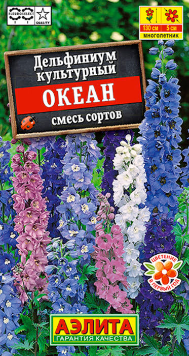 Дельфиниум Океан, смесь окрасок — это смесь многолетних дельфиниумов из группы Тихоокеанске Гибриды. Отмечена наградой международной организации производителей цветочных семян FLEUROSELECT за выдающиеся декоративные и технологические качества. Формирует компактные растения средней высоты (130 см) с 8-10 цветоносами. Цветки махровые, крупные – Ø4-5 см, в плотных колосовидных соцветиях 60-80 см длиной. Смесь отлично подходит для оформления цветников и для срезки. Срезанные соцветия стоят в вазе до двух недель. Растения зимостойкие, предпочитают солнечные места с защитой от ветров, с дренированной, плодородной почвой. При рассадном способе выращивания цветут в год посева.