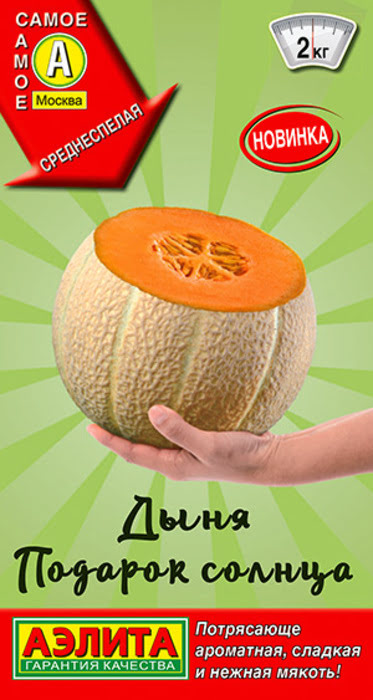 Дыня Подарок солнца — это сорт дыни, который не оставит равнодушным ни одного гурмана! Сочная, плотная и ароматная мякоть оранжевого оттенка просто тает во рту! Вкус очень сладкий, освежающий. Сорт среднеспелый – период от посева до созревания первого плода составляет около 90 дней. Отличается высокой устойчивостью к заболеваниям и ожогам, адаптированностью к перепадам температур и великолепной транспортабельностью. Масса дыни достигает 1,5-2,5 кг. Плоды отлично хранятся, не утрачивая вкуса и аромата. Нарезанная аккуратными кубиками дыня станет неповторимым украшением фруктовых салатов и коктейлей.