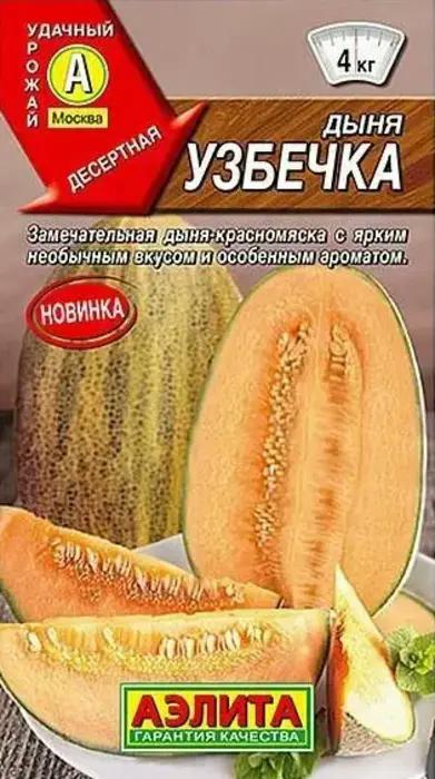 Дыня Узбечка — это сорт, с интенсивно окрашенной мякотью. Такие дыни называют красномясками и ценят за яркий цвет, необычный вкус и особенный аромат. Сорт среднеспелый, от всходов до созревания первых плодов 80-90 дней. Растения длинноплетистые, с хорошо развитым листовым аппаратом. Плоды овальные и удлиненно-овальные, массой 3-4 кг. Мякоть хрустящая, яркого розово-оранжевого оттенка. Цвет говорит о большом количестве бета-каротина – сильного антиоксиданта, эликсира долголетия, источника молодости. Во вкусе легко различается привкус ананаса, груши, земляники и ванили. Сорт идеально подходит для фруктовых салатов и других изысканных десертов.