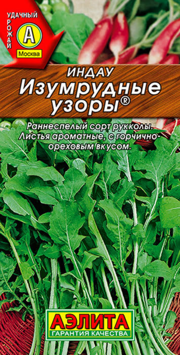 Индау (руккола) Изумрудные узоры — это раннеспелый сорт с большой вегетативной массой. Формирует урожай зелени 2,5 кг/м2 за 24-30 дней от всходов. Розетка густооблиственная, в фазу технической спелости высотой и диаметром 30 см. Масса одного растения 30 г. Листья длинные, широкие, с легким ароматом и горчично-ореховым вкусом.