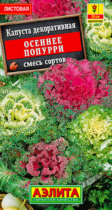 Капуста декоративная Осеннее попурри, смесь окрасок — это сорт с оригинальной яркой окраской. Образует шаровидно-плоские розетки, состоящие из крупных, гофрированных по краю листьев. Окраска наружных листьев розетки зеленая, а внутренних – разнообразная, от белой до пурпурной. Высота растений 20-25 см. С установлением прохладной погоды декоративная капуста приобретает наиболее привлекательную окраску. Используется в одиночных и групповых посадках, для оформления миксбордера и создания эффектных садовых компзиций.