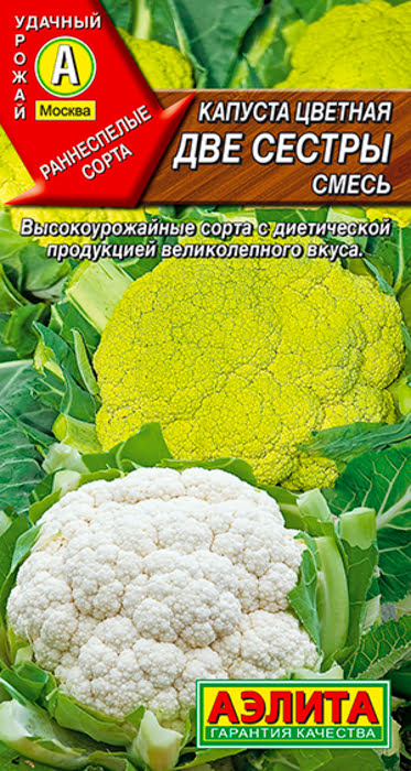 Капуста цветная Две сестры, смесь — это два скороспелых сорта – «Сноуболл 123» с головкой привычного белого цвета и «Универсал» — нежно-салатового оттенка. Растения сильнорослые, с плотными округло-плоскими головками массой 1,5 кг. Оба сорта характеризуются стабильно высокой урожайностью, отличными вкусовыми качествами, высоким выходом товарной продукции и способностью противостоять погодным стрессам. Хорошо удаются как в открытом грунте, так и в теплицах.
